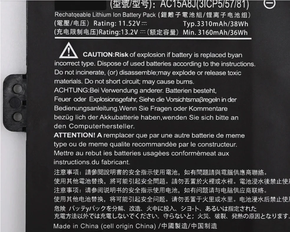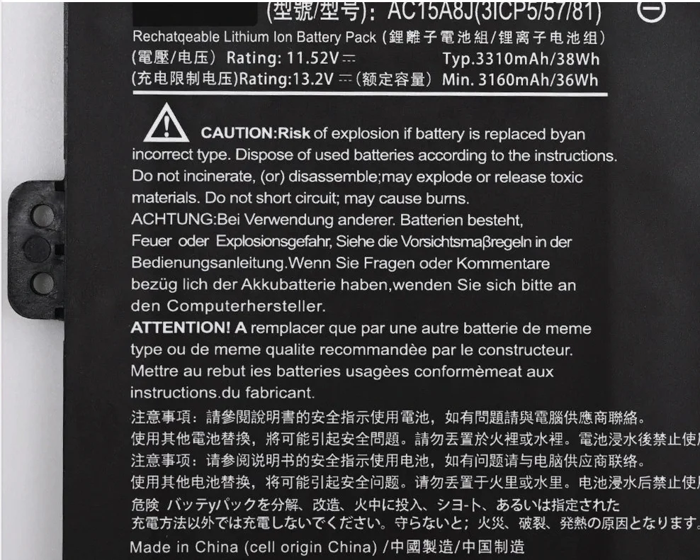 | Compatible Part Numbers | 132T, 132T-C32M, 132T-C732, 132T-C8KL, 132T-C8ZW, 3ICP5/51/81, 3ICP7, 52.5WH, 571G, 572G, 591G, 791G, 80-11.4V, AC14A8L, AC15A3J, AC15A8J, C1CA, C3KD, C3SZ, C4RW, C735, C738T, CB3-131, CB5, CB5-132T, KT.00303.017, KT00303016, KT00303017, KT00305004, R11, V15, VN7-571, VN7-571G, VN7-591, VN7-791, VN7-791G |