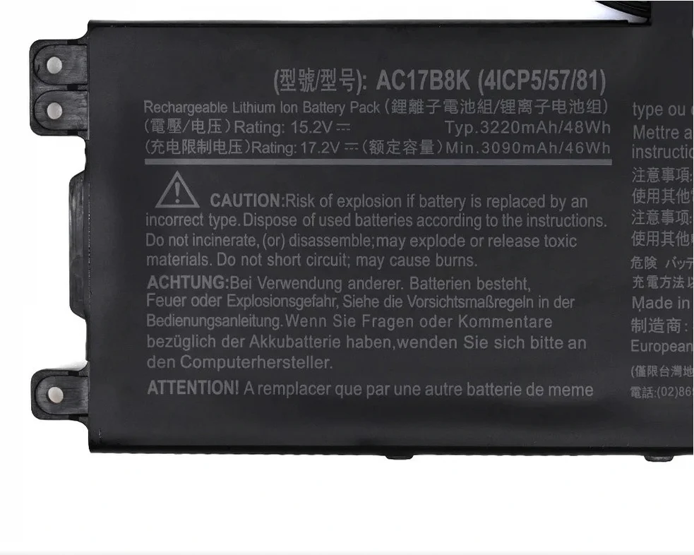 The Acer AC17B8K replacement battery delivers reliable power for the Aspire 1-131 and hundreds of compatible laptop models. This 15.2V 48Wh 3-cell lithium-ion battery provides dependable performance for ConceptD CC315-72-57WK, CC315-72P-726M, and 12ESW5-271 laptops. Engineered to meet the power demands of modern computing, this battery supports over 250 Acer laptop models across multiple series. Whether your laptop battery has stopped holding a charge or shows signs of degradation, the AC17B8K restores full mobility to your Acer system.