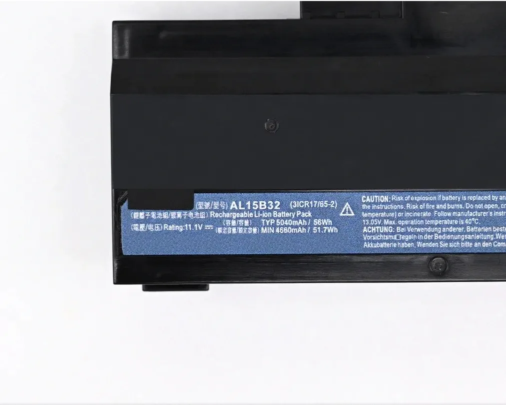 The Acer AL15B32 battery delivers reliable power for your Aspire V15 DG laptop with premium-grade lithium-polymer cells that undergo rigorous quality testing. This 11.1V, 51.7Wh replacement features 3-cell construction with 4660mAh capacity, engineered specifically for Acer T5000 and Aspire V15 DG series notebooks. Each battery passes multiple performance validation tests including charge cycles, temperature tolerance, and safety protocols to ensure consistent power delivery. The advanced Li-polymer chemistry provides stable voltage output and reliable performance for demanding computing tasks.