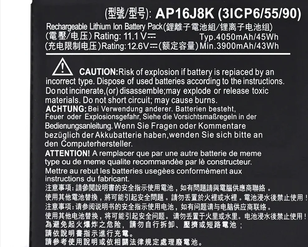 The Acer AP16J8K battery powers popular laptops including the widely-used Aspire E 15 E5-575G series. This 11.1V 36Wh 3-cell lithium-ion battery delivers reliable performance for daily computing tasks. Compatible models include the Aspire E5-575G-53VG, Spin 5 SP513-51, and Aspire E5-575-33BM. The 4050mAh capacity provides dependable power for work and entertainment on these versatile Acer laptops.