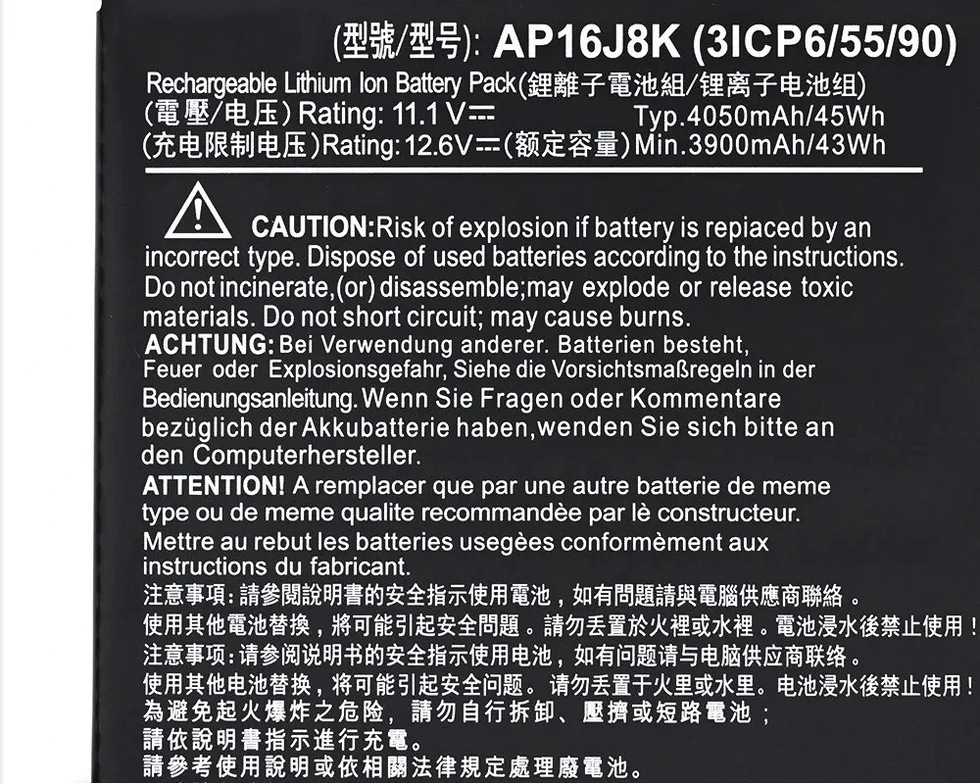 | Compatible Part Numbers | 0040G, 111M, 111P, 112M, 122P, 131T, 132P, 371T, 372T, 3ICP5, 3ICP6/55/90, 3INP5, 431T, 471T, 4ICP4, 4ICP5, 50P9, 50TP, 50U5, 51ES, 51GB, 51M5, 51TH, 52G3, 52HQ, 52P4, 52T3, 52XP, 53UB, 53YW, 53Z2, 54W2, 55GS, 560E, 56BF, 56T1, 56YW, 571T, 571TG, 57GR, 57LV, 58U3, 58YY, 70C7, 70T6, 70WB, 710B, 71PU, 728C, 72EV, 72LF, 72RG, 730P, 731G, 734M, 73BU, 74YP, 760U, 76E8, 76FH, 76NS, 76SA, 76Z3, 76ZJ, 76ZV, 771G, 78VL, 790F, 79FT, 79PD, 79QE, 79V5, 79Z5, A514-52, A514-52-58U3, A715, A715-74, A715-74G, AC14B18J, AC14B3K, AC14B8K, AN515-43, AN515-44, AN515-45, AN515-52, AN515-54, AN515-55, AN517-51, AN517-52, AN715-51, AP16J5K, AP16J8K, AP18C8K, AP18E7M, AP18E8M, B115-M, B115-MP, C731-C9J0, C731T, C731T-C42N, C731T-C5B8, C810, C8UB, C910, C933, CN315-71P, CN515-71, CN515-71P, KT0030G, KT00407009, NE512, PH315-52, PH315-53, PH317-52, PH317-53, PT315-51, R0YM, R27B, R4XJ, R9LY, SF314-42, SF314-57, SF314-57G, SF314-58, SF314-58G, TF71-BM, TG71-BM, TG81-BA, TG83-BA, VI04 |