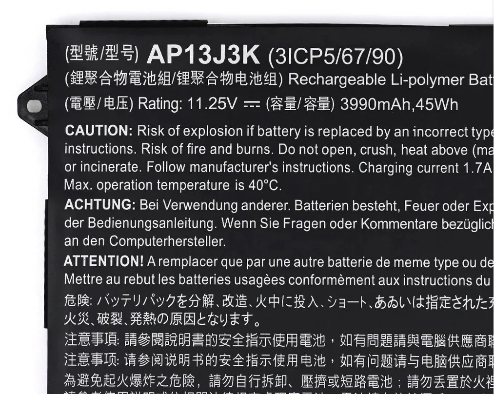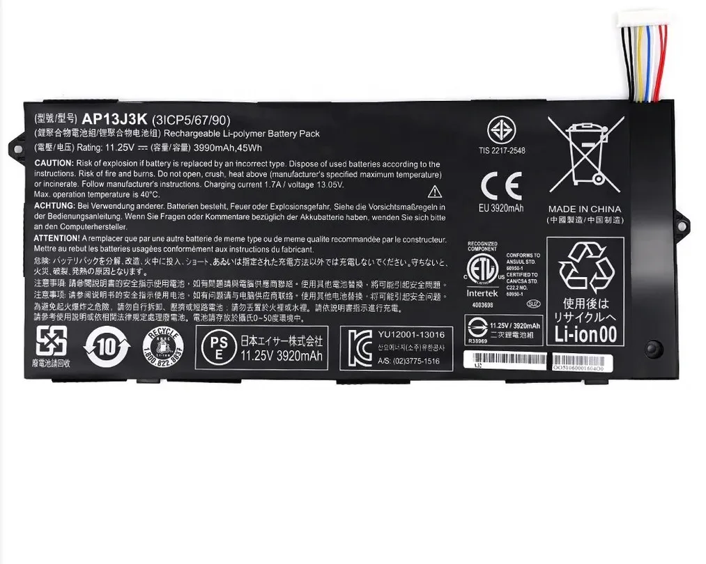 | Compatible Part Numbers | 0040G, 111M, 111P, 112M, 122P, 131T, 132P, 33BM, 371T, 372T, 392H, 3ICP5, 3ICP5/67/90, 431T, 471T, 475G, 4ICP5, 4ICR19, 523G, 52IF, 52JF, 53EJ, 54E8, 54SM, 553G, 571T, 571TG, 571TG-7229, 573G, 573T, 575G, 575G-33BM, 575G-51VI, 575G-52RJ, 575G-5341, 575G-53VG, 575G-549D, 575G-57D4, 575G-57KJ, 575G-59EE, 575G-59GV, 575G-765N, 575G-76YK, 575T, 575TG, 576G, 72N3, 731G, 74RC, 771G, 774G, A515-51, A515-51G, AC14B18J, AC14B3K, AC14B8K, AN515-51, AN515-52, AN515-53, AP13J3K, AP13J4K, AS16A5K, AS16A7K, AS16A8K, B115-M, B115-MP, C1DZ, C4A5, C4G4, C720-2420, C732L-C8QH, C810, C8UB, C910, CP5-471-5612, E576G-5762, KT.00303.001, KT.00304.001, KT0030G, N15W5, N16Q1, N16Q2, NE512, SF314-51, SF314-52, SF314-52G, TF71-BM, TG71-BM, TG81-BA, TG83-BA, VI04 |