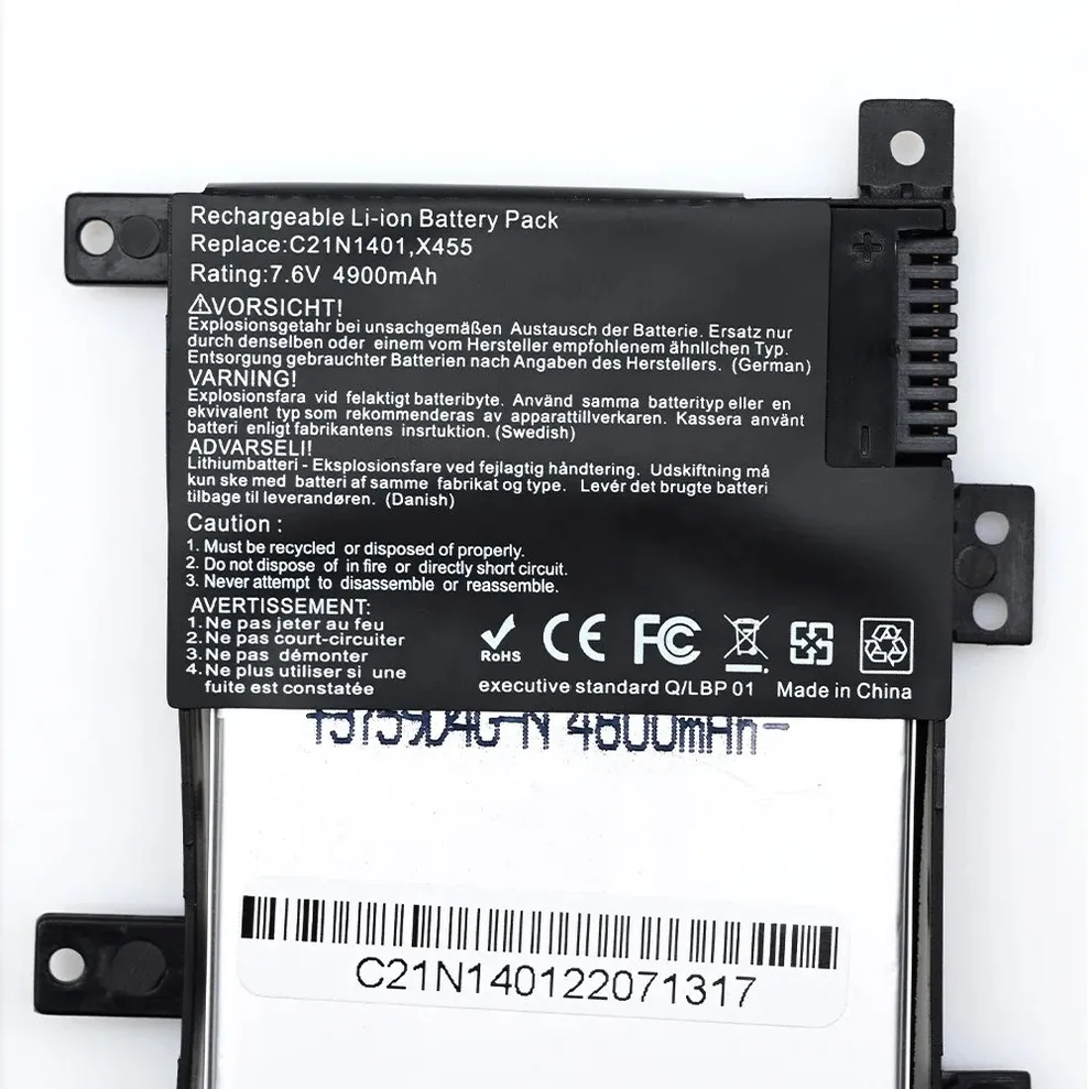 | Compatible Part Numbers | 455LA-WX080D, C21IN401, C21N1401, C21NI401, C21PQCH, DX882L, F454L, F455L, F455LD, K455L, PP21AT149Q-1, R455L, VM410L, W409L, W419L, X455, X455L, X455LA, X455LA-4030U, X455LA-N4030U, X455LA-WX002D, X455LA-WX040H, X455LA-WX053D, X455LA-WX053H, X455LA-WX058D, X455LA-WX063D, X455LA-WX078H, X455LA-WX081D, X455LA-WX082D, X455LA-WX086, X455LA-WX213H, X455LD, X455LF, X455LJ, Y483L, Y483LD |