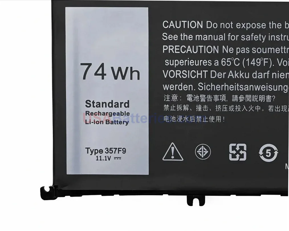 This direct-fit 357F9 replacement battery features the correct voltage of 11.4V and delivers 74.0Wh capacity with 4650mAh power storage. The 3-cell Li-Po chemistry construction uses Samsung cells for reliable performance and longevity. These specifications ensure your Dell laptop receives the proper power delivery it was designed for.