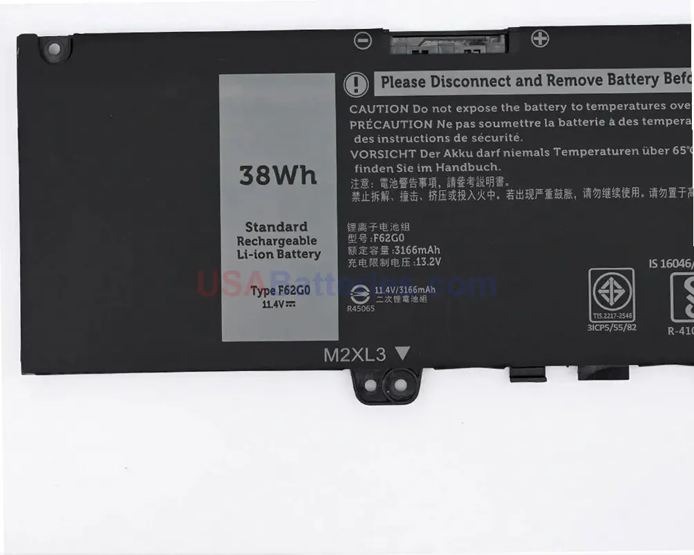 This direct-fit F62G0 replacement delivers the correct voltage of 11.4V with a substantial 38.0Wh capacity and 3166mAh rating. The battery utilizes advanced Li-Po chemistry with Samsung cells, providing efficient power management and reliable performance. These specifications match your original battery requirements exactly, ensuring seamless compatibility and proper charging cycles for your Dell laptop system.