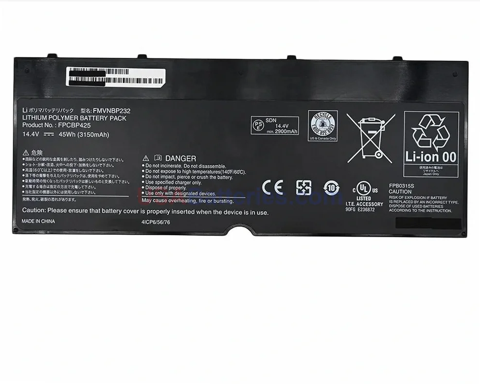 This is a new Fujitsu FMVNBP232 replacement battery for LifeBook T904 and compatible Fujitsu laptop models. The FMVNBP232 works with LifeBook T904, LifeBook T936, LifeBook T935, LifeBook U745, LifeBook T 904U, and other compatible systems. This battery replaces multiple part numbers including FPCBP425AP, FPCBP425, and CP703451-01. Whether you need a replacement for your business laptop or personal computer, the FMVNBP232 provides reliable power for extended mobile computing sessions.