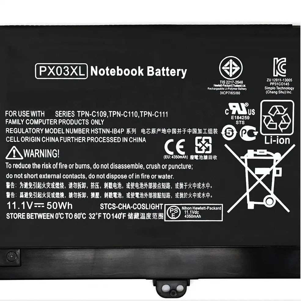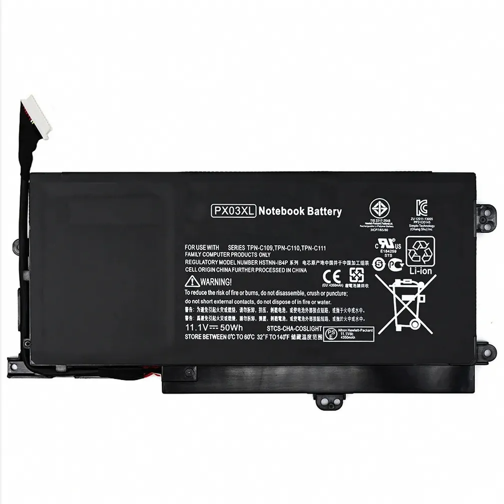 | Compatible Part Numbers | 14-K022TX, 14-K027TX, 14-K034TX, 14-K042TX, 14-K122TX, 14-K126TX, 2.96AH, 714762-1C1, 714762-2C1, BO03032XL, BO03032XL-PL, BO03032XL-PR, BO03XL, HSTNN-IB4P, HSTNN-IB6S, HSTNN-LB6S, HSTNN-UB6R, HSTNN-UB6S, PX03XL, TPN-C109, TPN-C110, TPN-C111, TPN-Q155 |