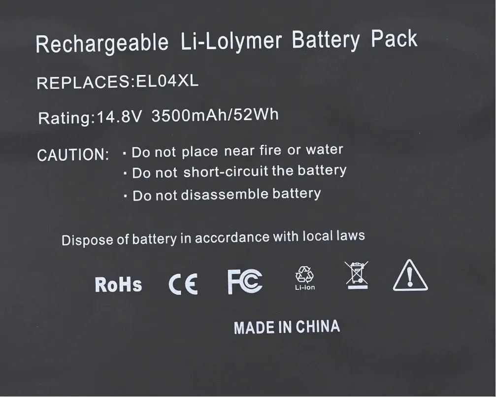 | Compatible Part Numbers | 15-AC, 15-AC121DX, 15-AC130DS, 15-AF, 15-AF087NW, 15-AF093NG, 15-AF112NR, 15-AF113CL, 15-AF131CA, 15-AY, 15-BA, 15-BA009DX, 15-BA079DX, 15-BA113CL, 4-1001TU, 4-1005XX, 4-1043CL, EL04XL, F053US, F113DX, G000, G000NA, G000NC, G000ND, G000NF, G000NK, G000NV, G000UR, G002NA, G002ND, G002NK, G002NO, G002NS, G003NG, G003NK, G003NM, G003NO, G003NS, G020NR, G020NZ, G020UR, G021NF, G022UR, G023NG, G024ND, G024NG, G024UR, G025DS, G025ND, G026DS, G026UR, G027DS, G027UR, G028DS, G077CL, G084CA, G099NR, G100, G100NA, G101AU, G101AX, G101DX, G102AU, G102AX, G130NR, G193UR, G194UR, G195NG, G195UR, G196UR, G198UR, G199NR, H504, HS03, HS03031-CL, HS04, HS04041-CL, HSTNN-DB6J, HSTNN-DB6K, HSTNN-DB6T, HSTNN-DB7J, HSTNN-IB6X, HSTNN-LB6I, HSTNN-LB6K, HSTNN-LB6R, HSTNN-LB6S, HSTNN-LB6U, HSTNN-LB6V, IB3R, K104, KI04, L119, N2L85AA, P030NR, P099NR, P100DX, P114DX, P133CL, P390NR, Q139, Q140, Q141, Q142, Q143, Q158, Q163, V006LA, V104, VI04, W121 |