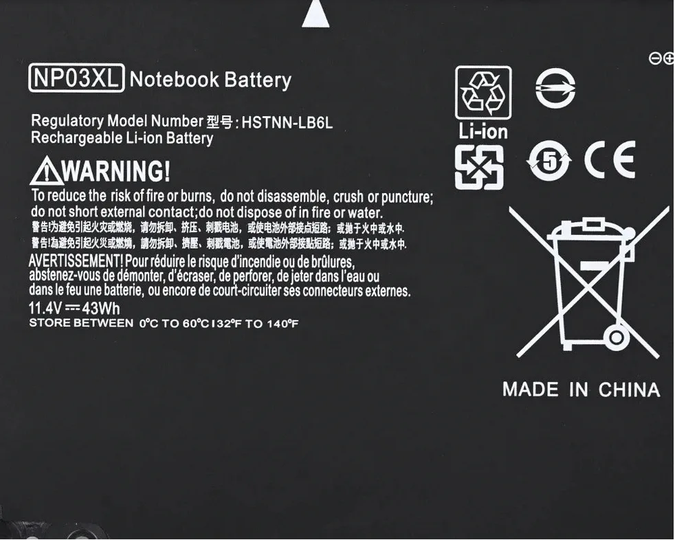 Compatible Part Numbers473CL, 760944-421, 761230-005, A010DX, A012DX, A013CL, A068CA, A072NR, A081NR, A091NR, A110DX, A113CL, A120LA, A233CA, A317CL, G6T84UA, HSTNN-LB6L, HSTNN-UB6L, J8C75PA, NP03XL, Q146, Q147, Q148, Q149, TPN-Q146, TPN-Q147, TPN-Q148, TPN-Q149, U010DX, U011DX, U050CA, U110DX, U111DX, U310NR, U337CL, U363CL, U399NR, U410NR, U437CL, U473CL, U483CL, U493CL, U499NR, X360