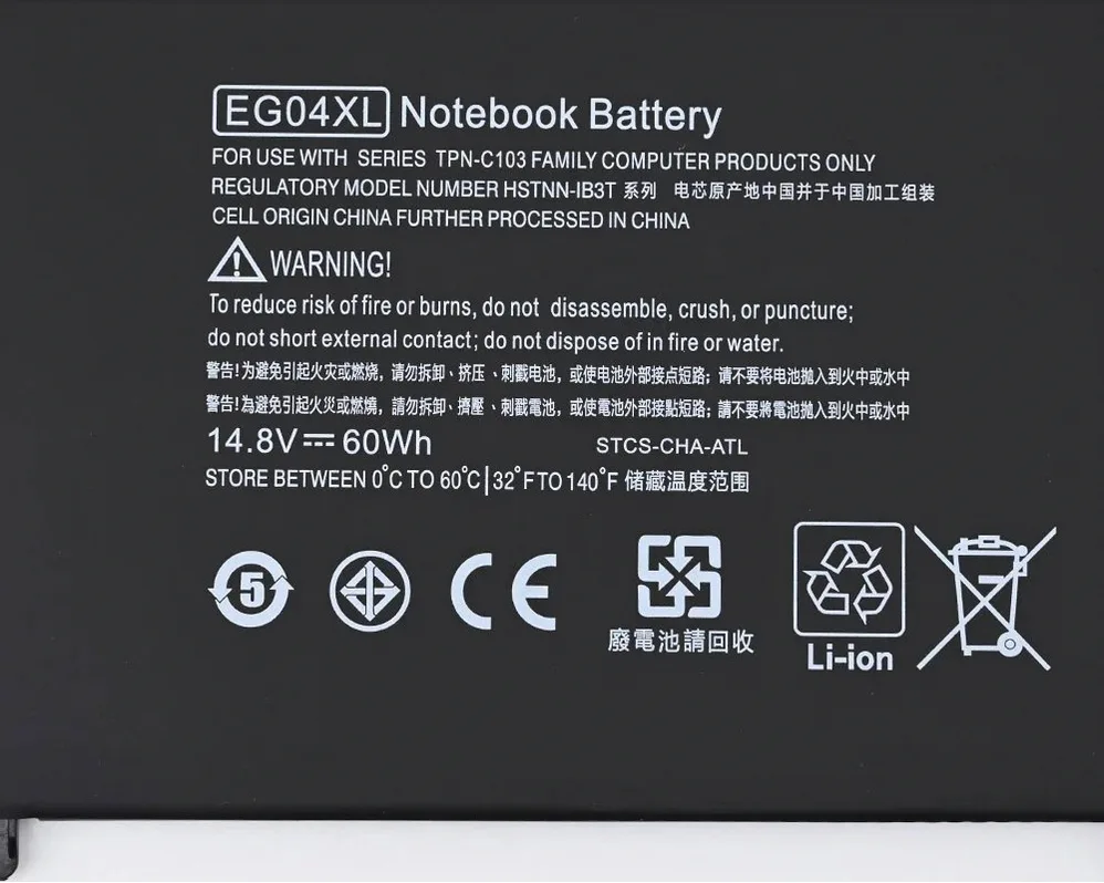 | Compatible Part Numbers | 1001TU, 1002TU, 1002TX, 1003TU, 1003TX, 1004TU, 1005TX, 1006EA, 1006TU, 1006TX, 1007TU, 1007TX, 1008TU, 1008TX, 1009TU, 1010SA, 1011TU, 1011TX, 1012TU, 1012TX, 1013TU, 1014TU, 1015TU, 1015TX, 1016TU, 1016TX, 1017TU, 1030EC, 1051ER, 1090SE, 14-CE, 14-CF, 14-DF, 15-CS, 15-CW1XXX, 15-DA, 15-DA0014DX, 15-DB, 15-DB0004DX, 15-DW, 15-DY, 17-BY, 17-CA, 681881-121, 681881-171, 681881-271, 681951-001, BY0022CY, BY0053CL, BY1033DX, BY1053DX, BY2075CL, C103, C108, CA0064CL, CA1065CL, CR0017NR, CR0064ST, CS0025CL, CS0053CL, CS0057OD, CS0058OD, CS0064ST, CS0073CL, CS0XXX, CS1063CL, CS1065CL, CS200, CS2064ST, CS2073CL, CS300, CS3065CL, CS3073CL, CS3153CL, CS3672CL, CS3XXX, CU0058NR, CW000, CW0001LA, CW0001NS, CW100, CW1004LA, CW1063WM, CW1068WM, CW1XXX, DA0002DX, DA0014DX, DA0032WM, DA0033WM, DA0053WM, DA0073MS, DA0XXX, DA1005DX, DB0004DX, DB0005DX, DB0011DX, DB0015DX, DW0033NR, DW0035CL, DW0037WM, DW0038WM, DW0043DX, DW0053NL, DW100, DW2025CL, DY0013DX, DY1043DX, DY1076NR, DY1751MS, EG04, EG04XL, EGO4XL, G000, G000NA, G000NC, G000ND, G000NF, G000NK, G000NV, G000UR, G002NA, G002ND, G002NK, G002NO, G002NS, G003NG, G003NK, G003NM, G003NO, G003NS, G020NR, G020NZ, G020UR, G021NF, G022UR, G023NG, G024ND, G024NG, G024UR, G025DS, G025ND, G026DS, G026UR, G027DS, G027UR, G028DS, G077CL, G084CA, G099NR, G100, G100NA, G101AU, G101AX, G101DX, G102AU, G102AX, G130NR, G193UR, G194UR, G195NG, G195UR, G196UR, G198UR, G199NR, HSTNN-DB3T, HSTNN-DB6T, HSTNN-DB8R, HSTNN-IB3T, HSTNN-IB6X, HSTNN-LB6R, HSTNN-LB6S, HSTNN-UB7J, HT03XL, K104, KI04, L11119-855, Q158, Q163, TPN-C103, TPN-C108, VK04 |