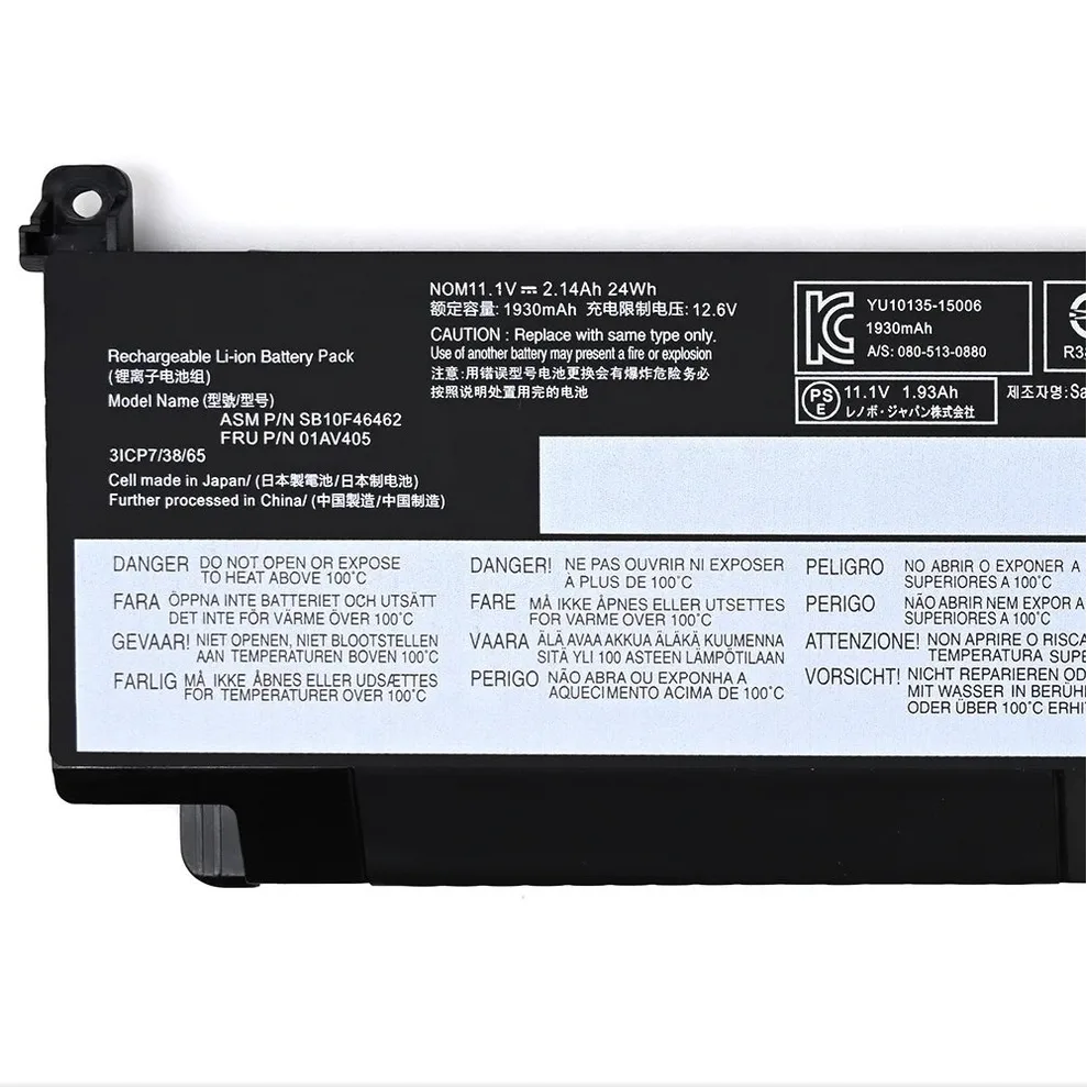 The Lenovo 01AV405 serves as a direct replacement battery for ThinkPad T460s and T470s laptops experiencing power issues or degraded battery performance. This 11.1V 24Wh 4-Cell Li-ion battery delivers reliable performance for models including the T460s-2MCD, T460s-2NCD, and T460s-2PCD. With its 2140mAh capacity, this battery provides consistent power output to keep your ThinkPad running smoothly throughout your workday.