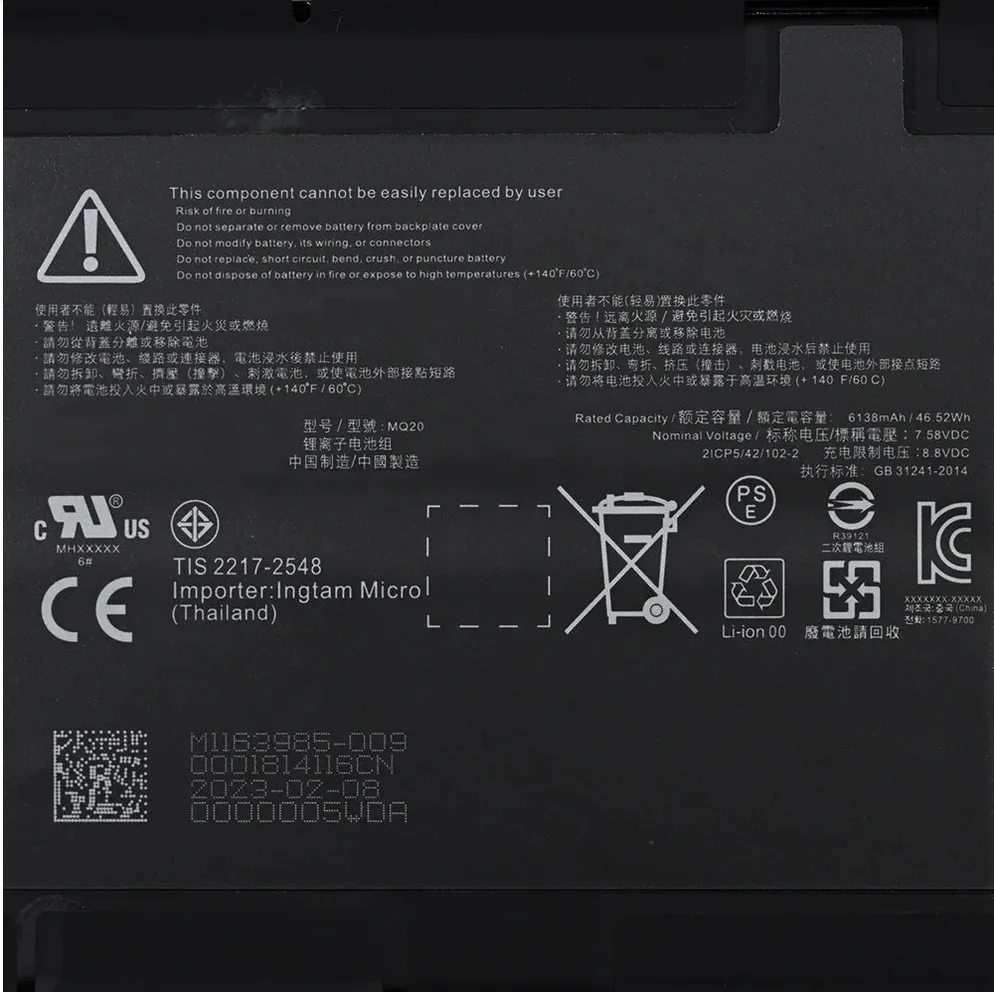 The Microsoft M1163985-018 replacement battery is specifically designed for the Surface Pro 9 2032 tablet. This 7.58V 39.7Wh lithium-ion battery features a 2-cell configuration with 5235mAh capacity to restore your tablet’s portability and performance. Built to precise specifications, this battery seamlessly integrates with your Microsoft Surface Pro 9, delivering reliable power for work, creativity, and entertainment. The advanced Li-ion chemistry ensures consistent performance throughout countless charge cycles.