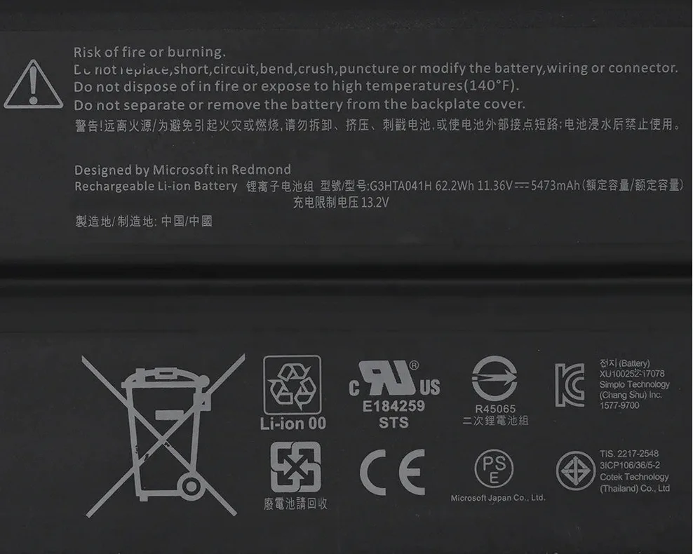 Replacement battery for Microsoft Surface Book and Pro 13″ series laptops.