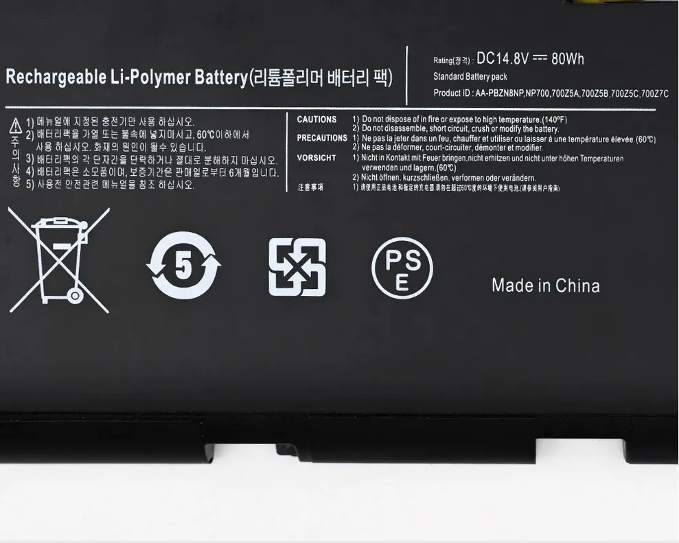 | Compatible Part Numbers | AA-PBZN8NP, BA43-00318A, BA43-00318A(14.8V, NP-700, NP-700Z, NP700Z5A, NP700Z5AH, NP700Z5B, NP700Z5C, NP700Z5CH, NP700Z7A, NP700Z7C, NP770Z7E, NT700Z5A, P42GL5-01, P42GL5-01-N01, PBZN8NP |
