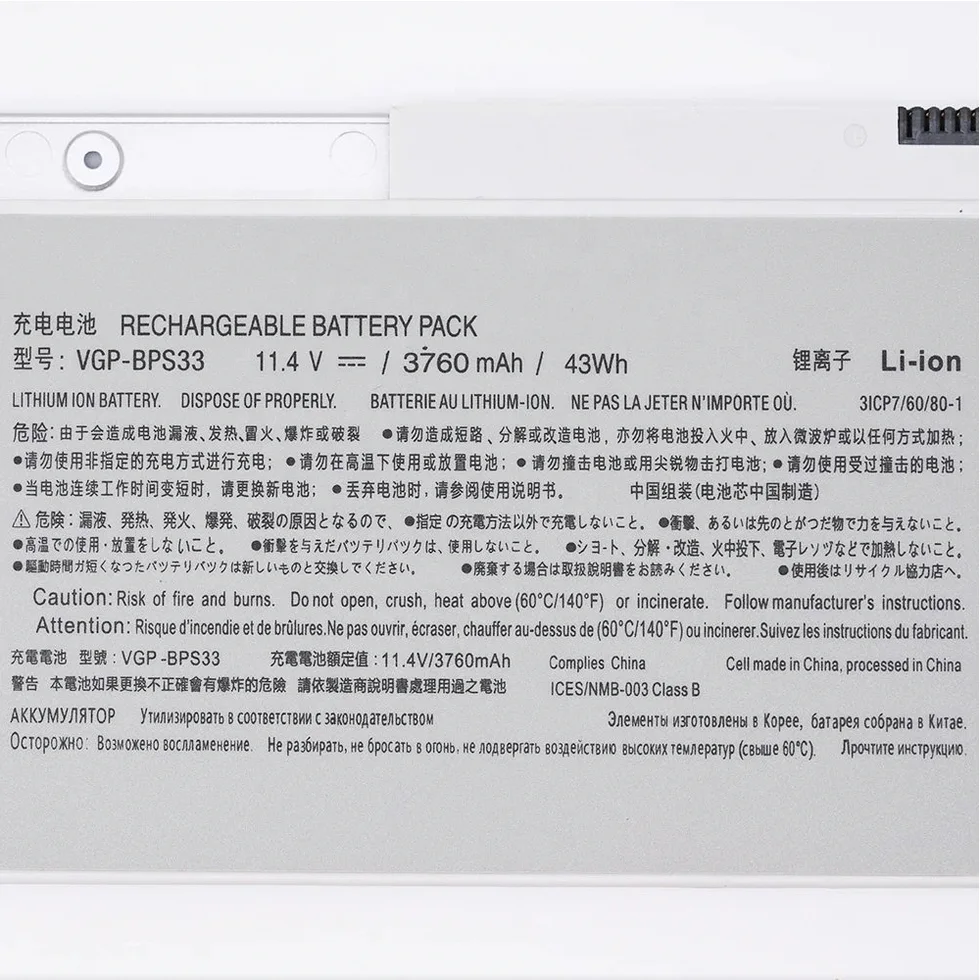 | Compatible Part Numbers | 1X0111B, 3ICP7, A1493, BPS33, ICP5, J8BPS52, NP13V1AV012P, SVT-14, SVT-15, SVT14, SVT14112CXS, SVT14113CNS, SVT14113CV, SVT14113CVS, SVT14113CX, SVT14113CXS, SVT14115CLS, SVT14115CV, SVT14115CVS, SVT14115CW, SVT14115CXS, SVT14116PN, SVT14116PNS, SVT14117CBS, SVT14117CGS, SVT14117CHS, SVT14117CW, SVT14117CXS, SVT14118CC, SVT14118CCS, SVT1411BPXS, SVT14123CNS, SVT14124CXS, SVT14125CXS, SVT14125PNS, SVT14126CNS, SVT14126CV, SVT14126CVS, SVT14126CW, SVT14126CXS, SVT14127CG, SVT14127CGS, SVT14127CH, SVT14127CHS, SVT14127CL, SVT14127CSX, SVT14128CC, SVT141290X, SVT14129CC, SVT14129CCS, SVT141A11L, SVT141C11L, SVT141C11T, SVT141C11W, SVT15, SVT15112CXS, SVT15115CXS, SVT151190X, SVT1511ACXS, SX12, SX14, T14, T14118CC, T15, VGP-BPS33, VGPBPS33, VJ8BPS52, VJPG11C11N, VJS112C, VJS112C0111B, VJS112C0211W, VJS112C0311S, VJS112C0411T, VJS112C0511B, VJS112C0611W, VJS112C0711B, VJS112C0811P, VJS112C0911W, VJS112C1011B, VJS112C1111W, VJS112C1211P, VJS112C1311S, VJS112C1411T, VJS131C, VJS131C0111B, VJS131C0211S, VJS131C0411B, VJS132C, VJS132C0411B, VJS132C0511B, VJS132C0611S, VJS132C0711B, VJS132C0811S, VJS132C11L, VJS132C11N, VJS132C11T, VJS132C11W, VJS141C, VJS141C0111R, VJS141C0211T, VJS141C0311A, VJS141C0411T, VJS141C0511A, VJS141C11L |